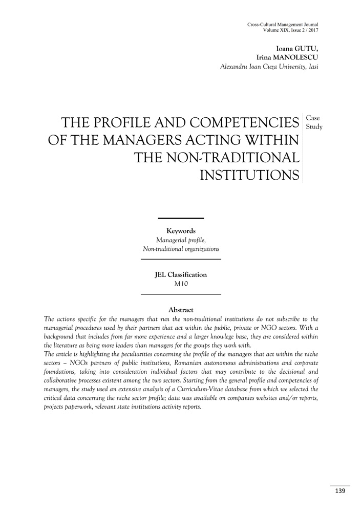 The actions specific for the managers that run the non-traditional institutions do not subscribe to the managerial procedures used by their partners that act within the public, private or NGO sectors. With a background that includes from far more experience and a larger knowlege base, they are considered within the literature as being more leaders than managers for the groups they work with. The article is highlighting the peculiarities concerning the profile of the managers that act within the niche sectors – NGOs partners of public institutions, Romanian autonomous administrations and corporate foundations, taking into consideration individual factors that may contribute to the decisional and collaborative processes existent among the two sectors. Starting from the general profile and competencies of managers, the study used an extensive analysis of a Curriculum-Vitae database from which we selected the critical data concerning the niche sector profile; data was available on companies websites and/or reports, projects paperwork, relevant state institutions activity reports.