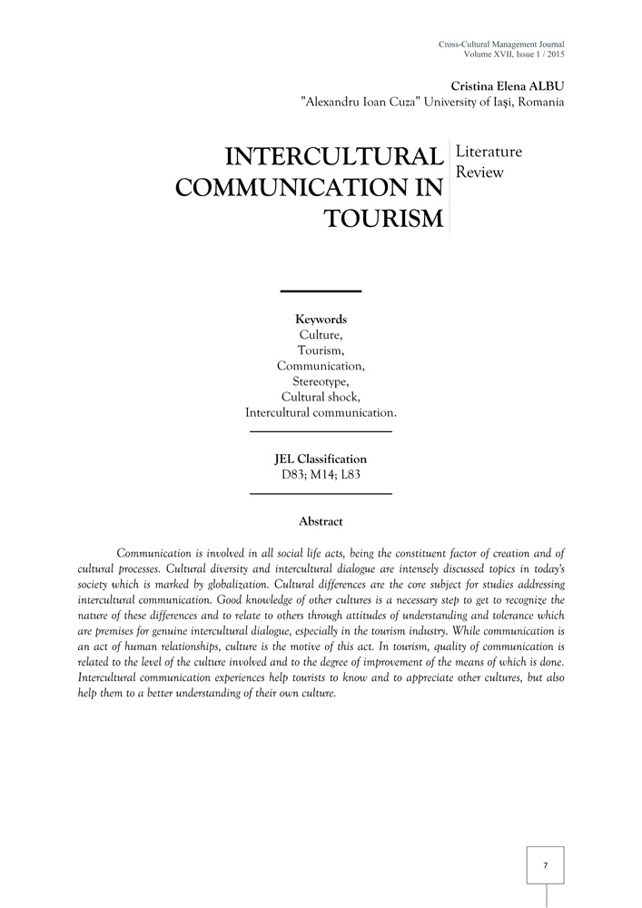 Communication is involved in all social life acts, being the constituent factor of creation and of cultural processes. Cultural diversity and intercultural dialogue are intensely discussed topics in today's society which is marked by globalization. Cultural differences are the core subject for studies addressing intercultural communication. Good knowledge of other cultures is a necessary step to get to recognize the nature of these differences and to relate to others through attitudes of understanding and tolerance which are premises for genuine intercultural dialogue, especially in the tourism industry. While communication is an act of human relationships, culture is the motive of this act. In tourism, quality of communication is related to the level of the culture involved and to the degree of improvement of the means of which is done. Intercultural communication experiences help tourists to know and to appreciate other cultures, but also help them to a better understanding of their own culture.