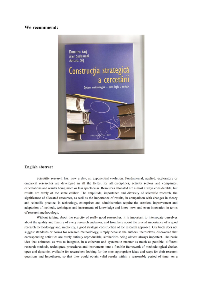 Scientific research has, now a day, an exponential evolution. Fundamental, applied, exploratory or empirical researches are developed in all the fields, for all disciplines, activity sectors and companies, expectations and results being more or less spectacular. Resources allocated are almost always considerable, but results are rarely of the same caliber. The amplitude, importance and diversity of scientific research, the significance of allocated resources, as well as the importance of results, in comparison with changes in theory and scientific practice, in technology, enterprises and administration require the creation, improvement and adaptation of methods, techniques and instruments of knowledge and know-how, and even innovation in terms of research methodology. Without talking about the scarcity of really good researches, it is important to interrogate ourselves about the quality and finality of every research endeavor, and from here about the crucial importance of a good research methodology and, implicitly, a good strategic construction of the research approach. Our book does not suggest standards or norms for research methodology, simply because the authors, themselves, discovered that corresponding activities are rarely entirely reproducible, similarities being almost always imperfect. The basic idea that animated us was to integrate, in a coherent and systematic manner as much as possible, different research methods, techniques, procedures and instruments into a flexible framework of methodological choice, open and dynamic, available for researchers looking for the most appropriate ideas and ways for their research questions and hypotheses, so that they could obtain valid results within a reasonable period of time. As a suggestion born from our approach, presented as a book titled “The strategic construction of research. The methodological choice – between logic and heuristic”, stands the idea that a rigorous research has to be based on a good, valid strategy and the corresponding methodological elements. The consequence of this idea was the structured development of a research philosophy together with its strategy construction, build around the main methodological dimensions, which are always specific, particular for a field, theme or problem for which we need answers, solutions, and anticipations.