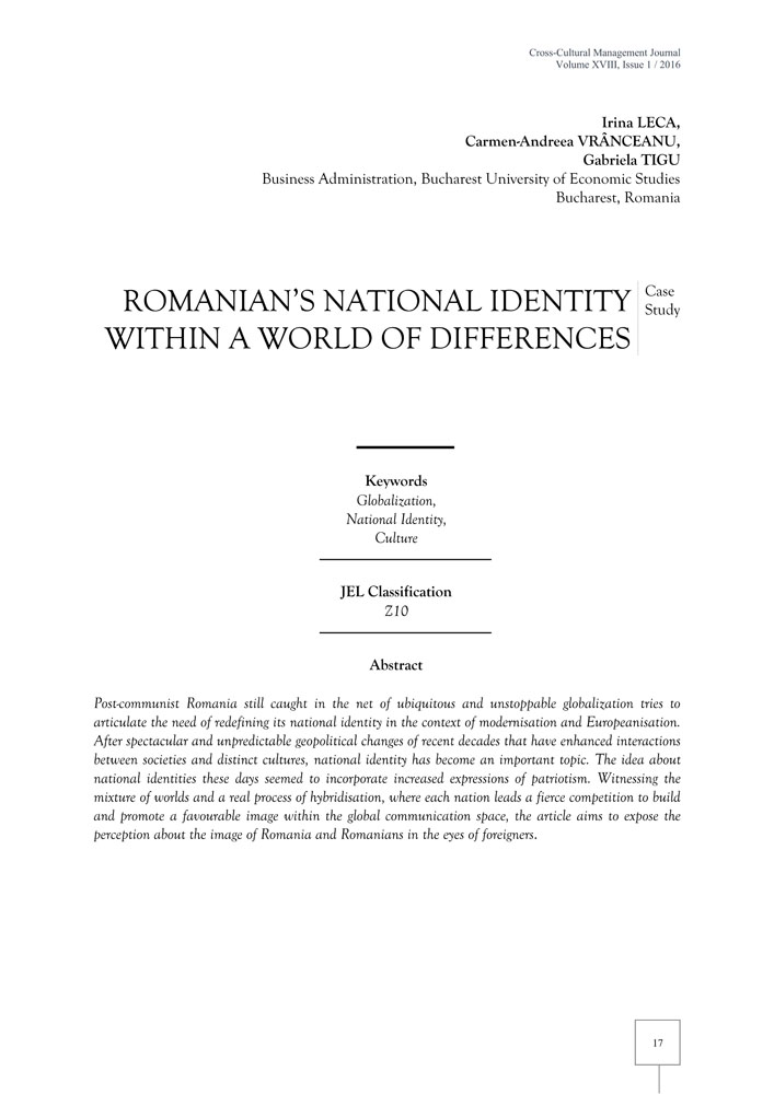 Post-communist Romania still caught in the net of ubiquitous and unstoppable globalization tries to articulate the need of redefining its national identity in the context of modernisation and Europeanisation. After spectacular and unpredictable geopolitical changes of recent decades that have enhanced interactions between societies and distinct cultures, national identity has become an important topic. The idea about national identities these days seemed to incorporate increased expressions of patriotism. Witnessing the mixture of worlds and a real process of hybridisation, where each nation leads a fierce competition to build and promote a favourable image within the global communication space, the article aims to expose the perception about the image of Romania and Romanians in the eyes of foreigners.