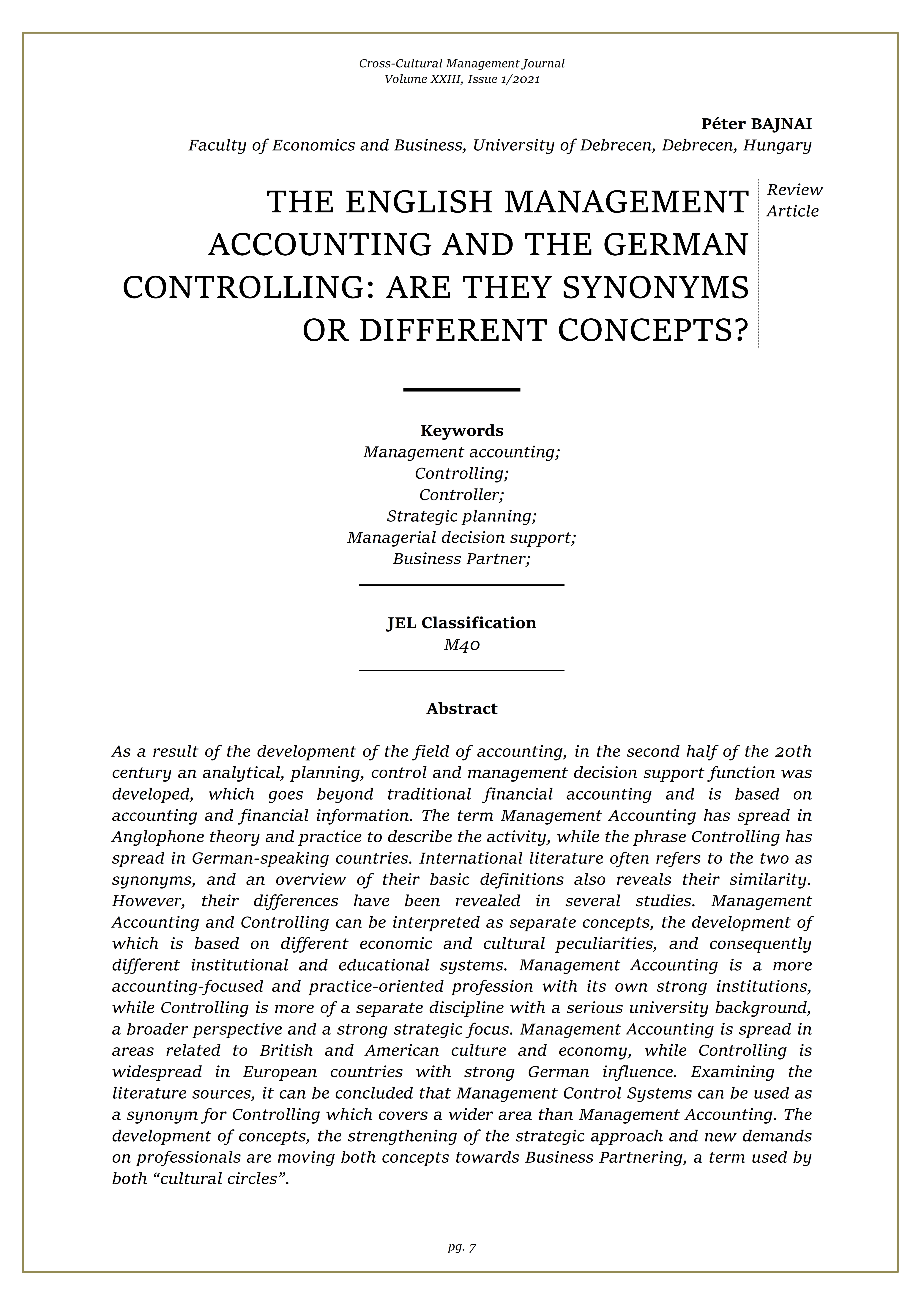 - Keywords: Management accounting; Controlling; Controller; Strategic planning; Managerial decision support; Business Partner;
