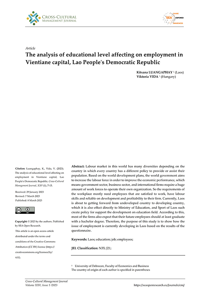 - Citation: Luangaphay, K., Vida, V. (2023). The analysis of educational level affecting on employment in Vientiane capital, Lao People's Democratic Republic. Cross-Cultural Management Journal, Year (Volume) XXV, Issue (1/2023), 7-15.