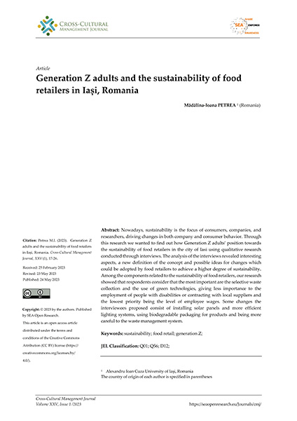 - Citation: Petrea M.I. (2023). Generation Z adults and the sustainability of food retailers in Iași, Romania. Cross-Cultural Management Journal, Year (Volume) XXV, Issue (1/2023), 17-26.