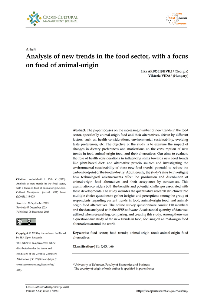 - Citation: Arbolishvili L., Vida V. (2023). Analysis of new trends in the food sector, with a focus on food of animal-origin. Cross-Cultural Management Journal, Year (Volume) XXV, Issue (2/2023), 113-124.